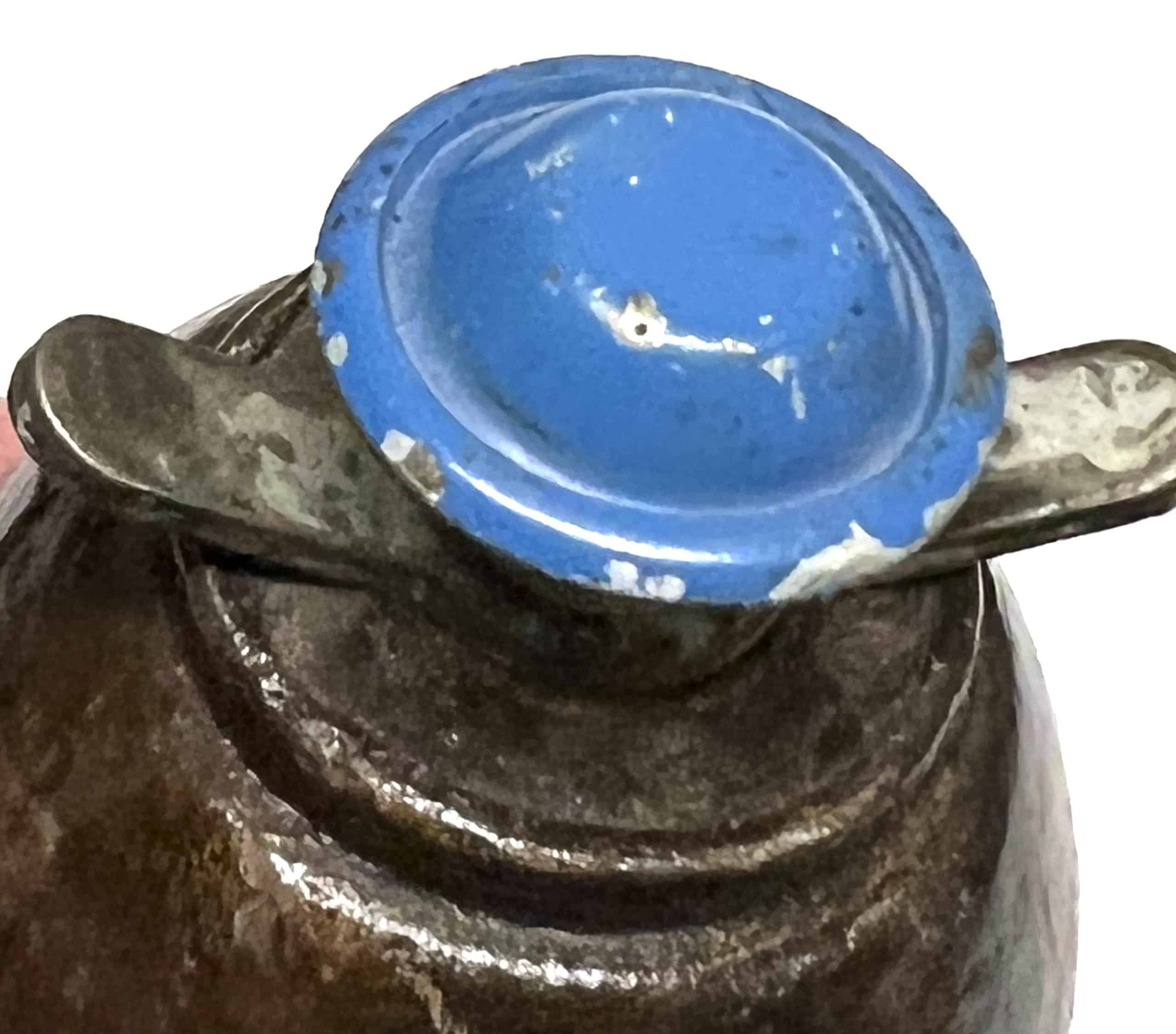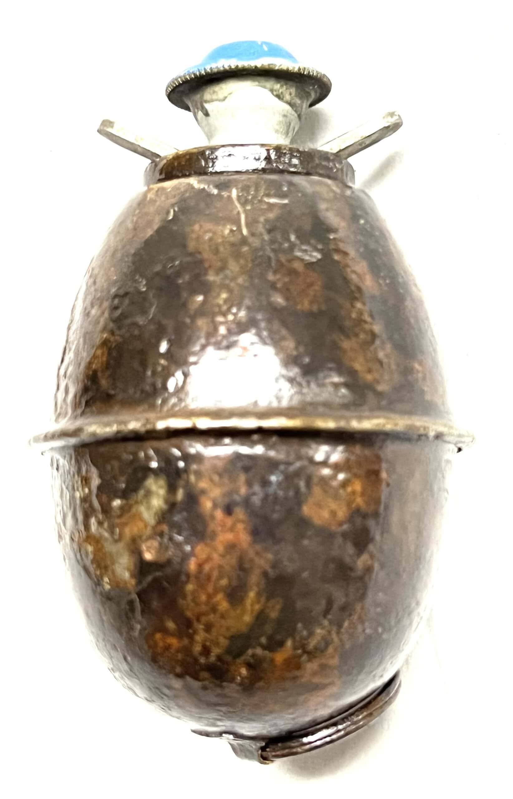 Here is a hard to locate M 1939 fragmentation grenade. It is completely inert with 4.5 second screw in fuse bearing original blue paint and metal attaching ring on the base.