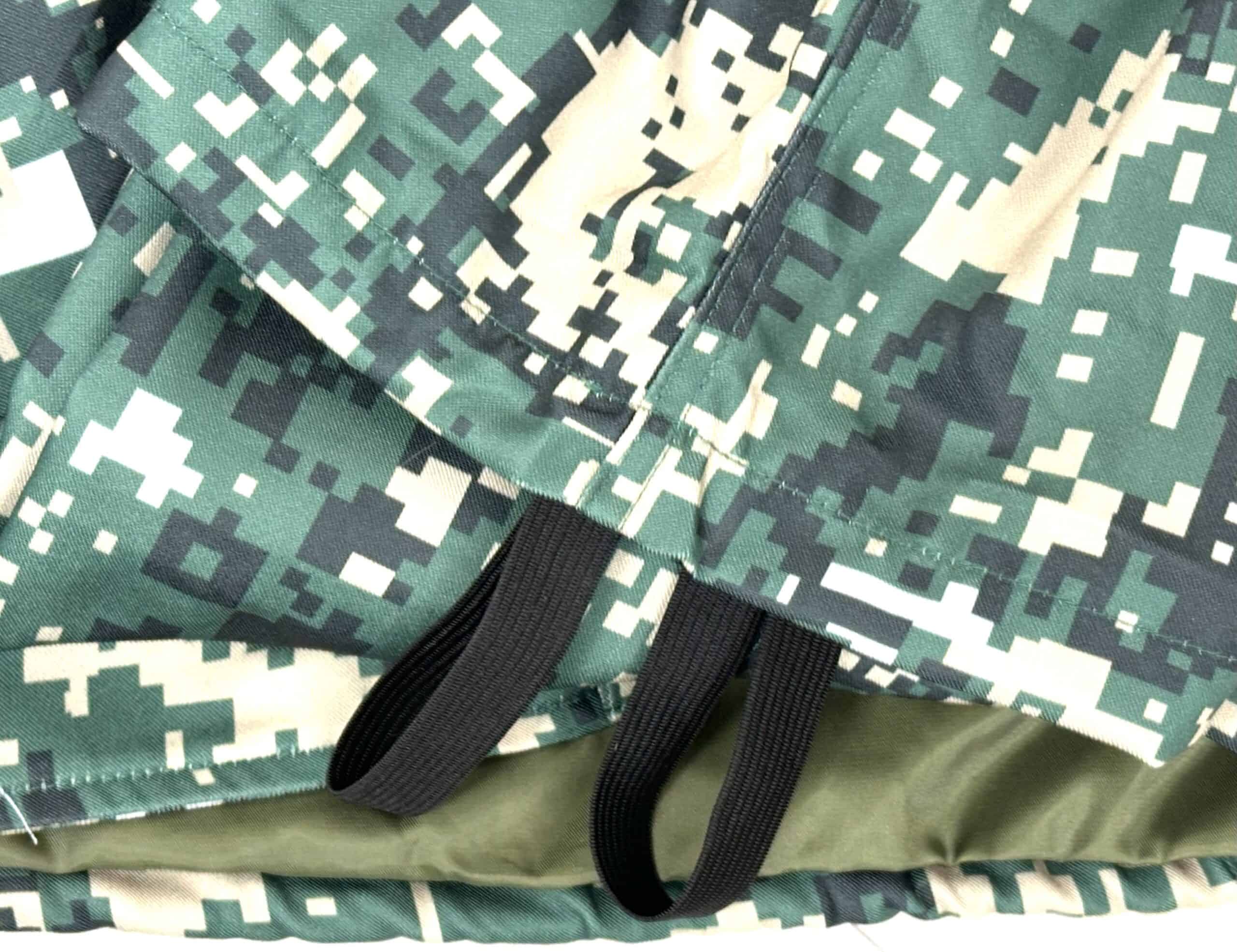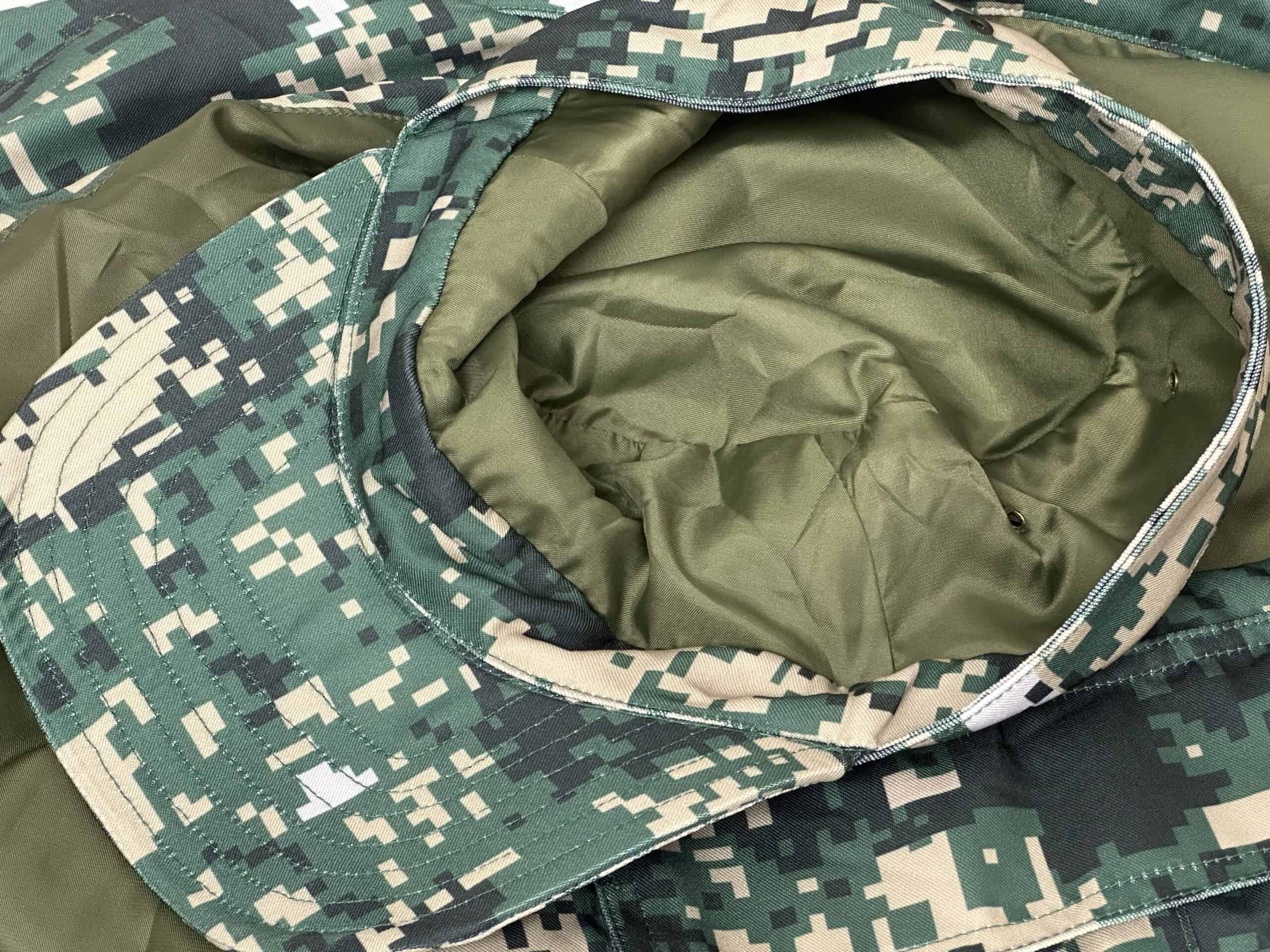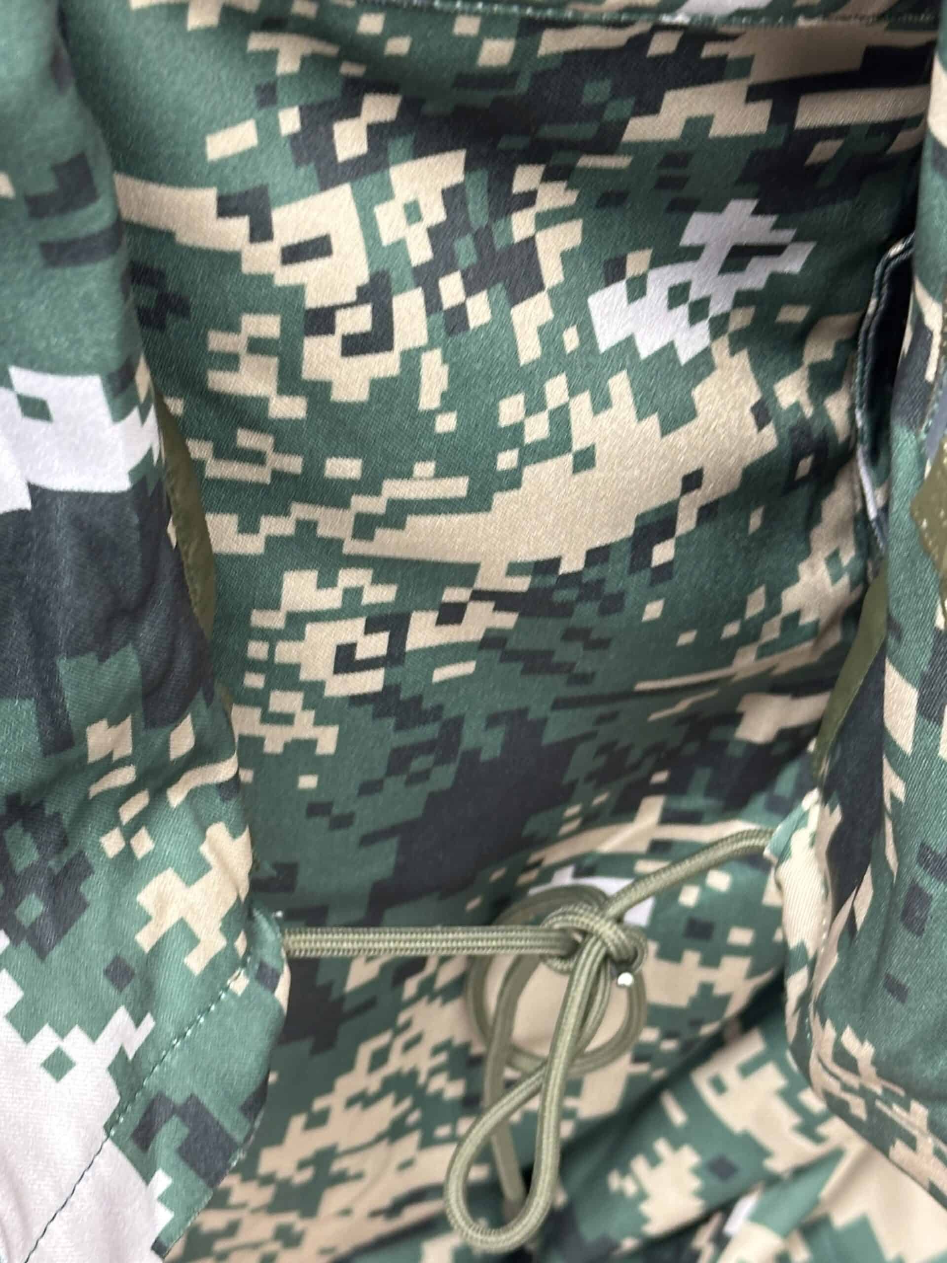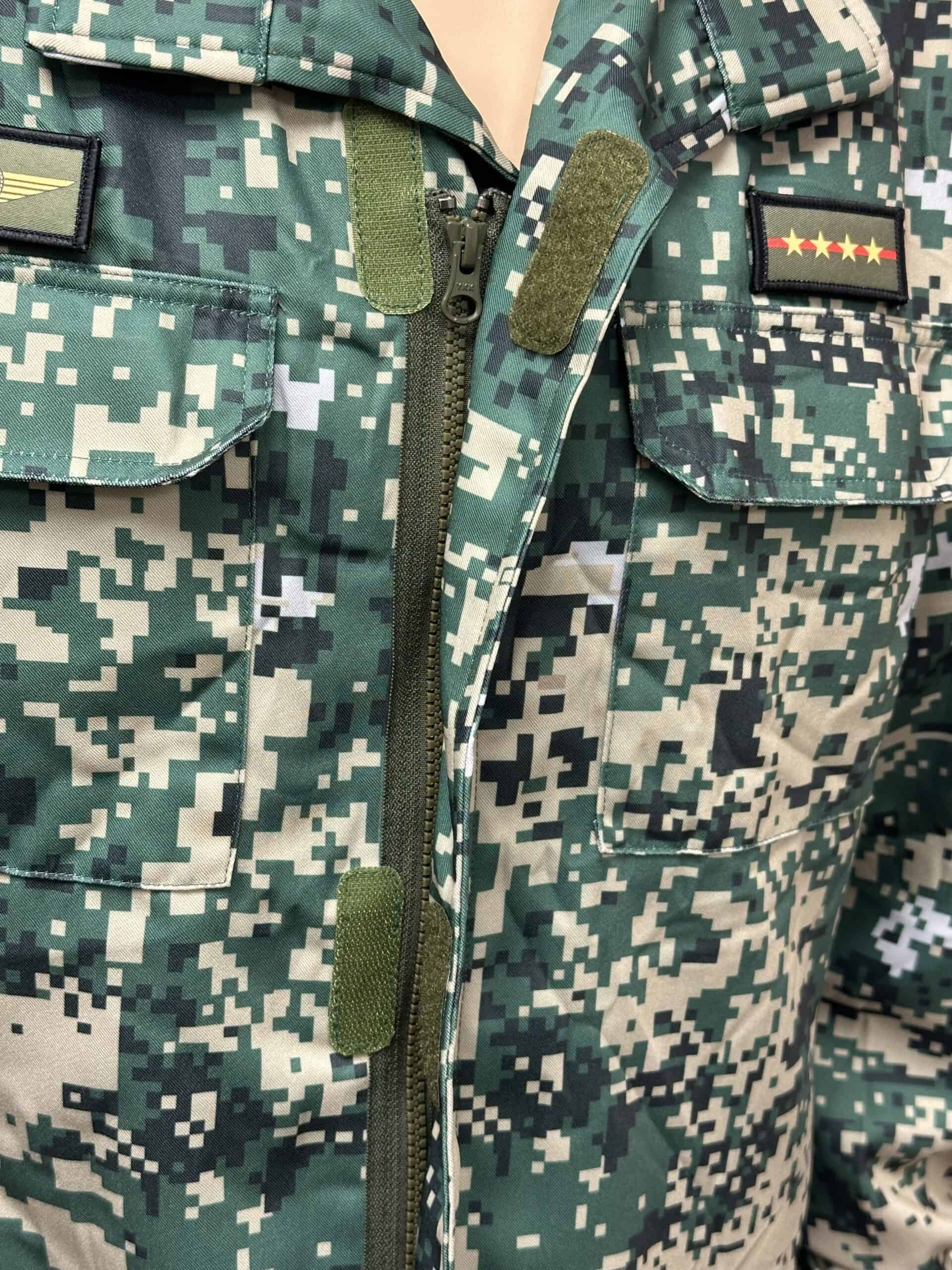 Tunic, lined like the cap, with padding in the shoulders between the exterior camo and ling, with five KPA embroidered velcro backed patches including a senior captain rank, parachutist jump wings, national flag etc., size is about a US 40 to 42 Asian large, fake YKK zippers and drawstring at the bottom.