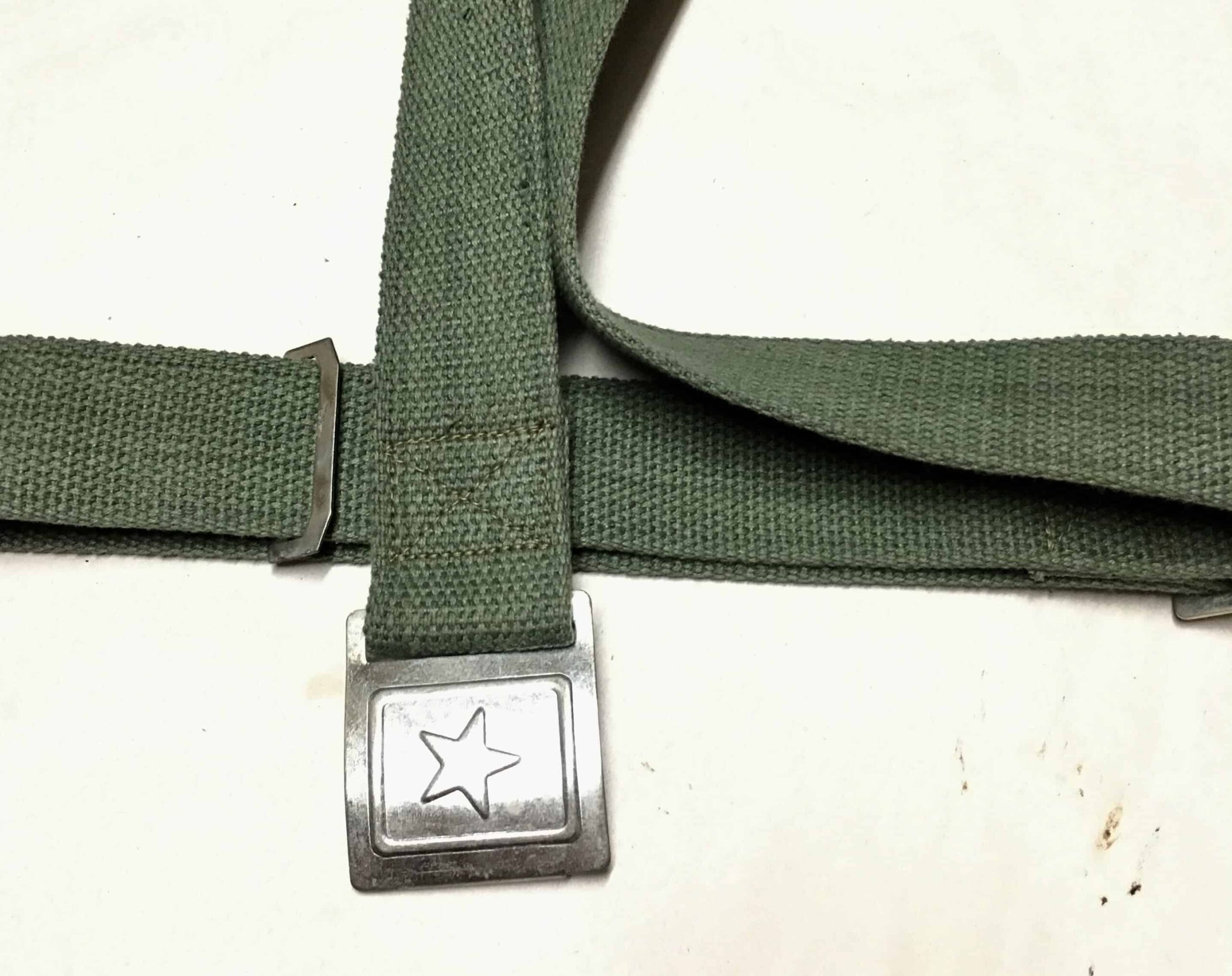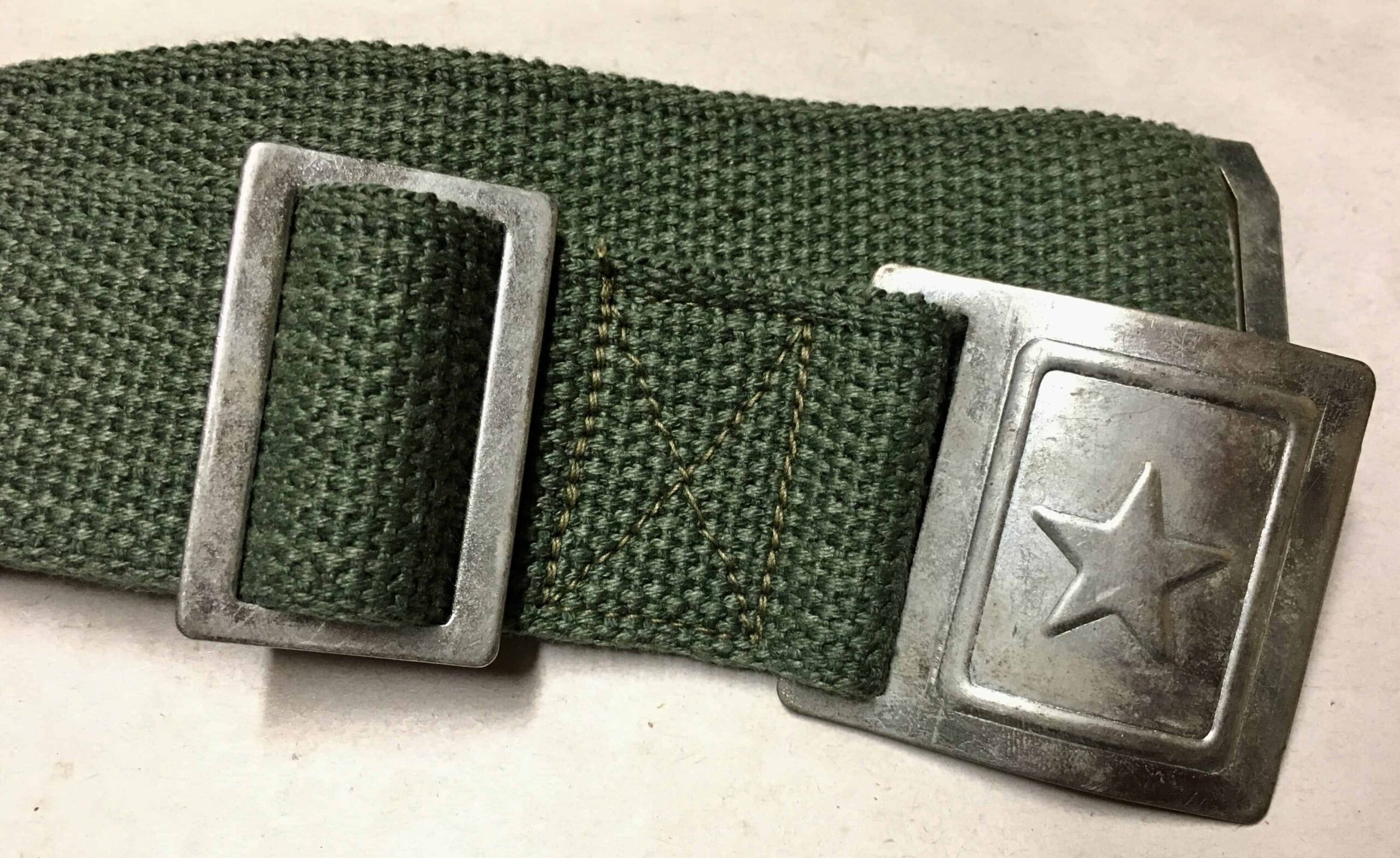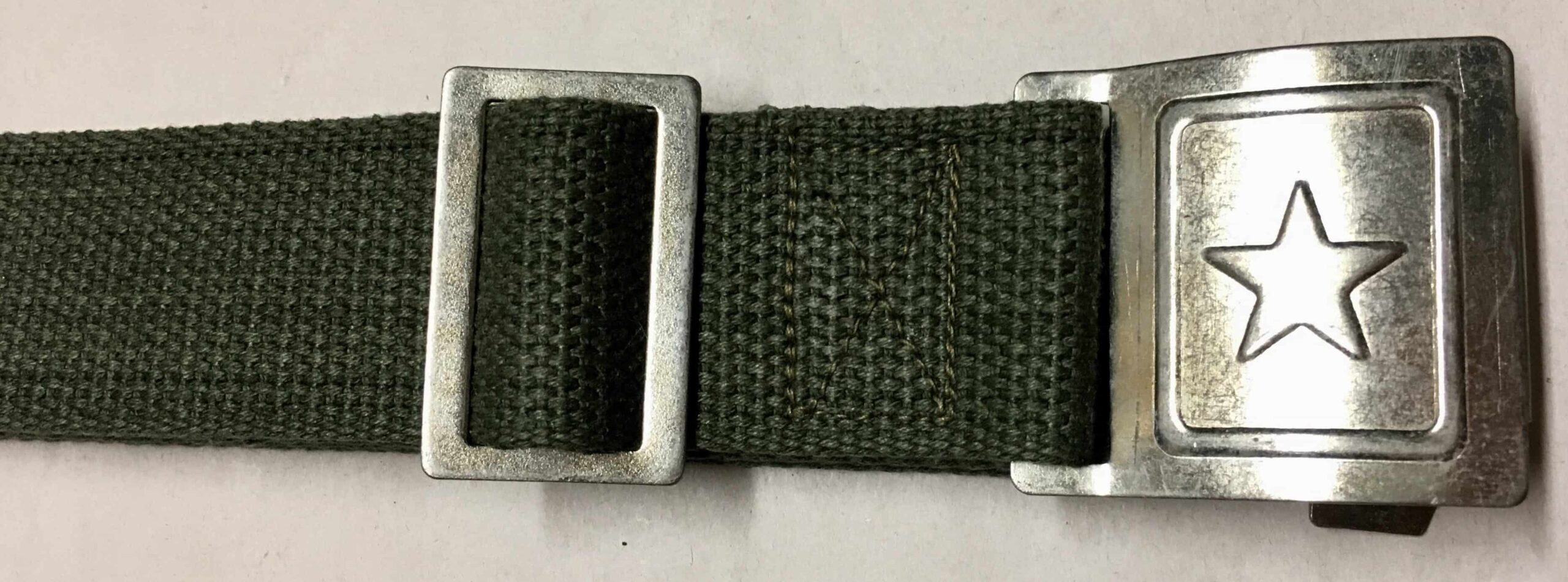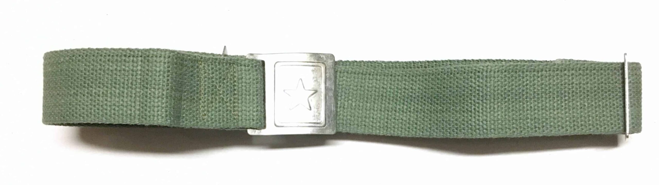 This is the standard KPA web belt used since the 1950s. The buckle and keepers are thin stampings. The web is that North Korean green gray color.