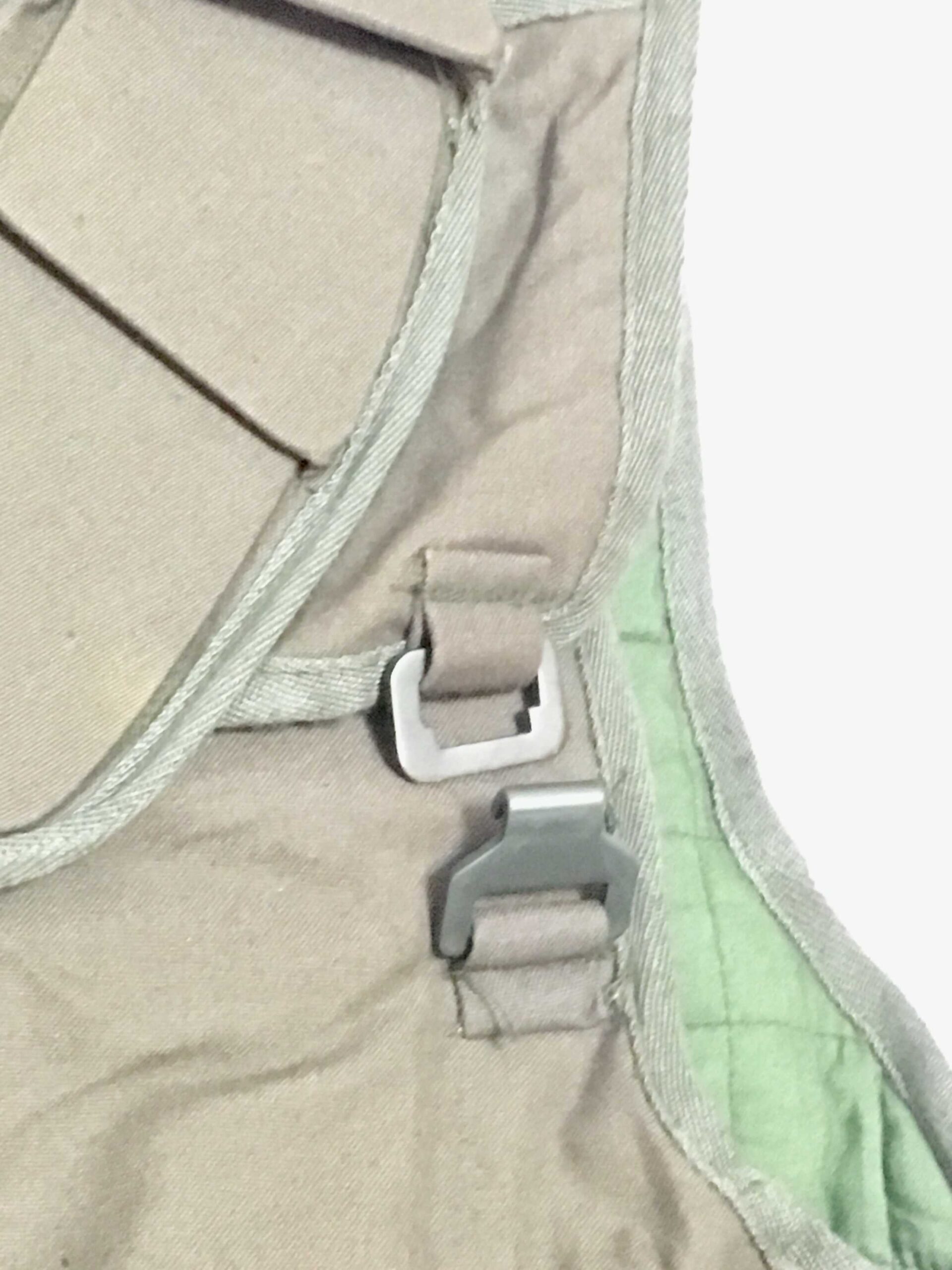 The body armor was ChiCom made. It consisted of heavy overlapping metal plates attached together then covered by a cotton cover that was sewn on. The neck was closed by a ChiCom button of the type found on their export tunics. A lime green web strap wrapped around the waist and was secured by a metal buckle. Another web strap, in the shape of a Y, came from both sides of the rear panel and buckled in front. These straps could be adjusted. The hardware on the webbing was made of aluminum in an effort to prevent rust. As there is no photographic evidence we have seen showing Chinese PLA troops wearing body armor at the same time, we believe this early Chinese body armor was made to Hanoi's specifications and used exclusively by the NVA.