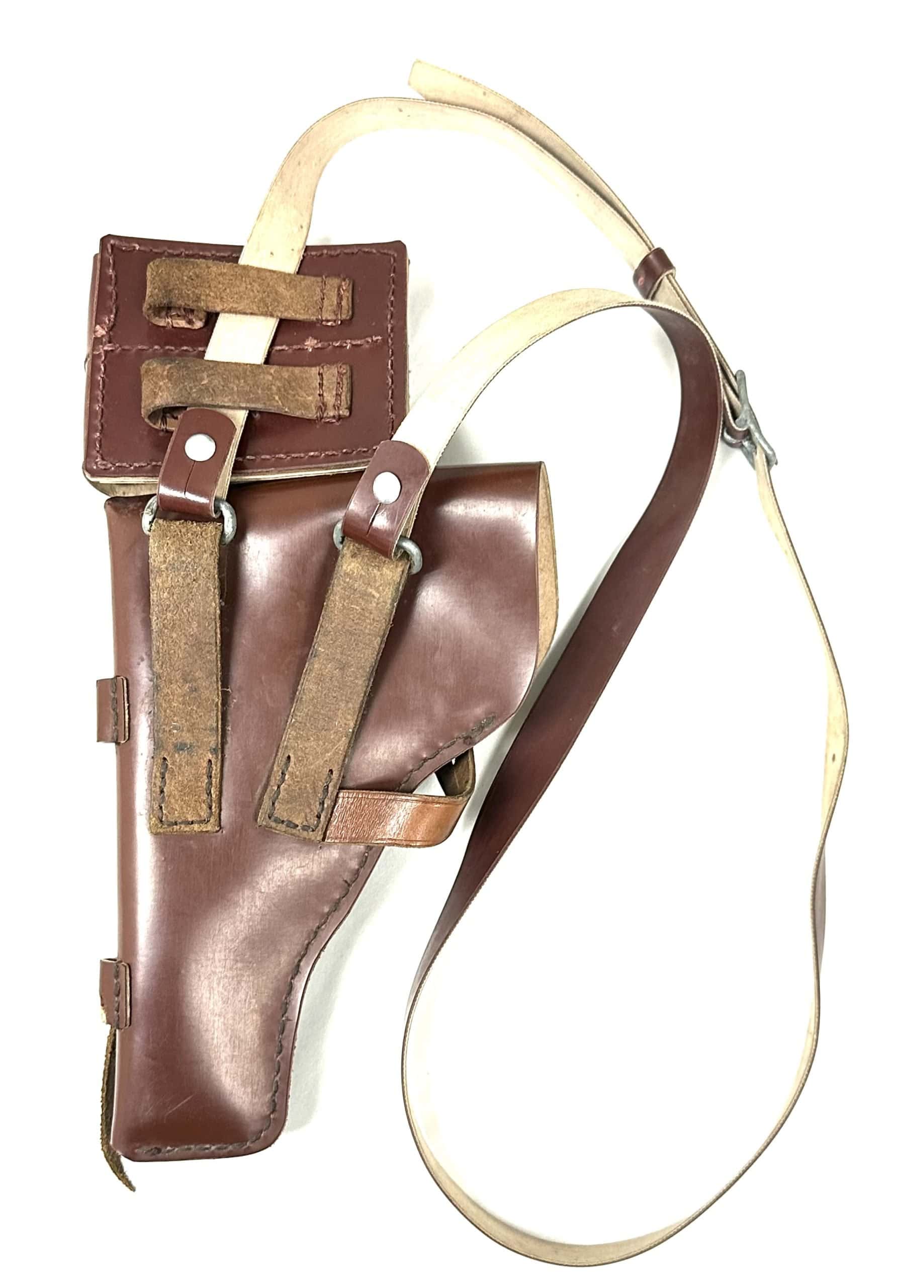 PRC made holsters were issued with an adjustable shoulder strap attached to the galvanized metal rings on the back of the holster. Most straps were removed as they tended to wear into the shoulder and became an uncomfortable nuisance over time. Sometimes the stitching that holds the belt loops onto the body of the holster wears out and the loops have to be resewn.