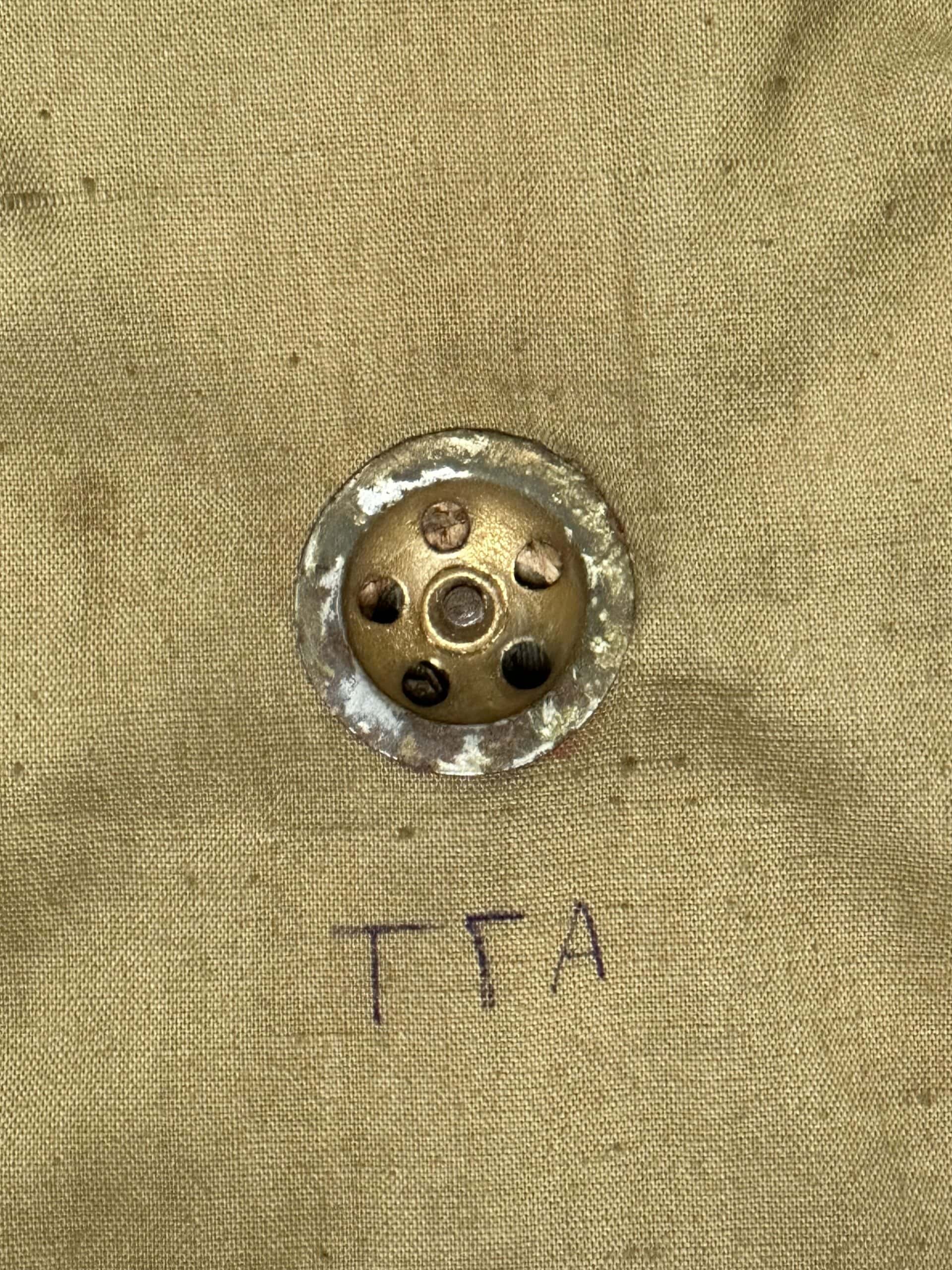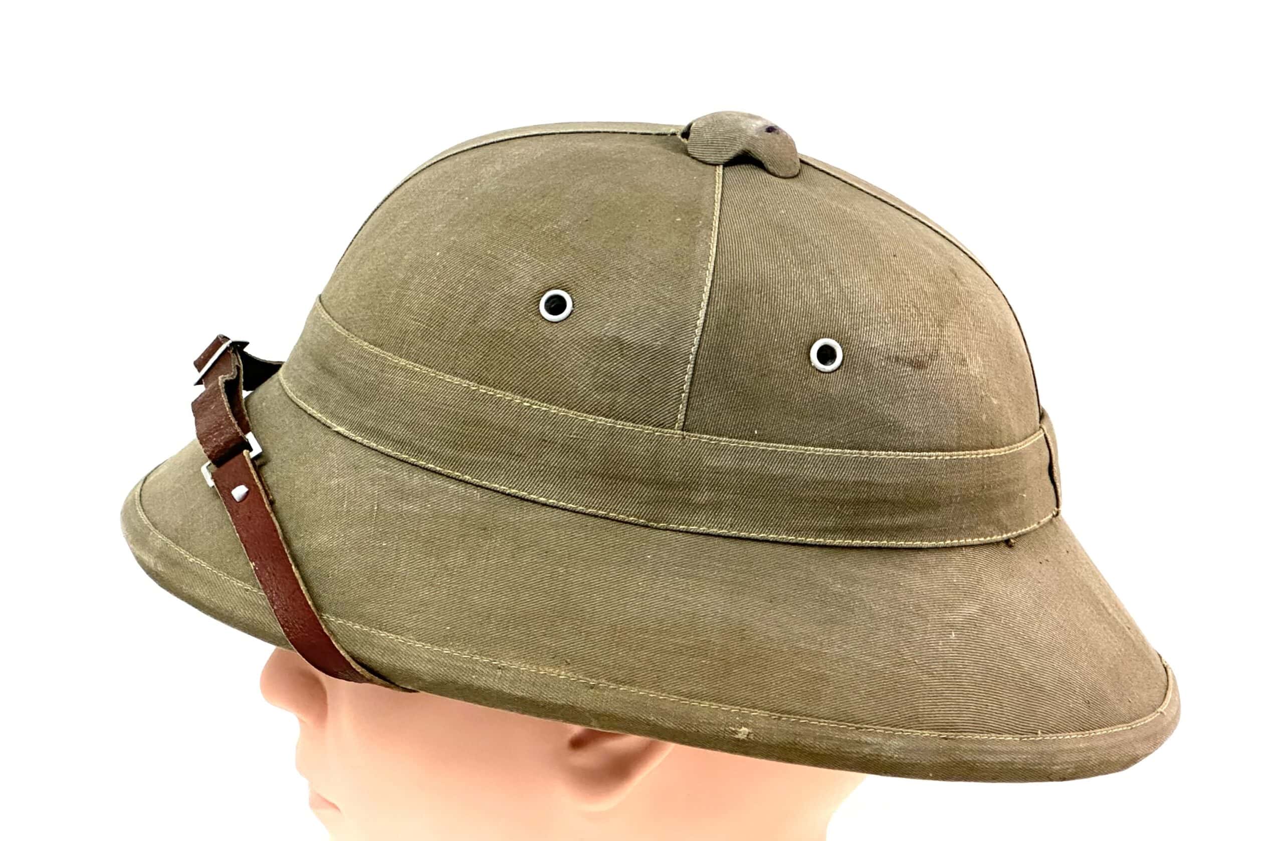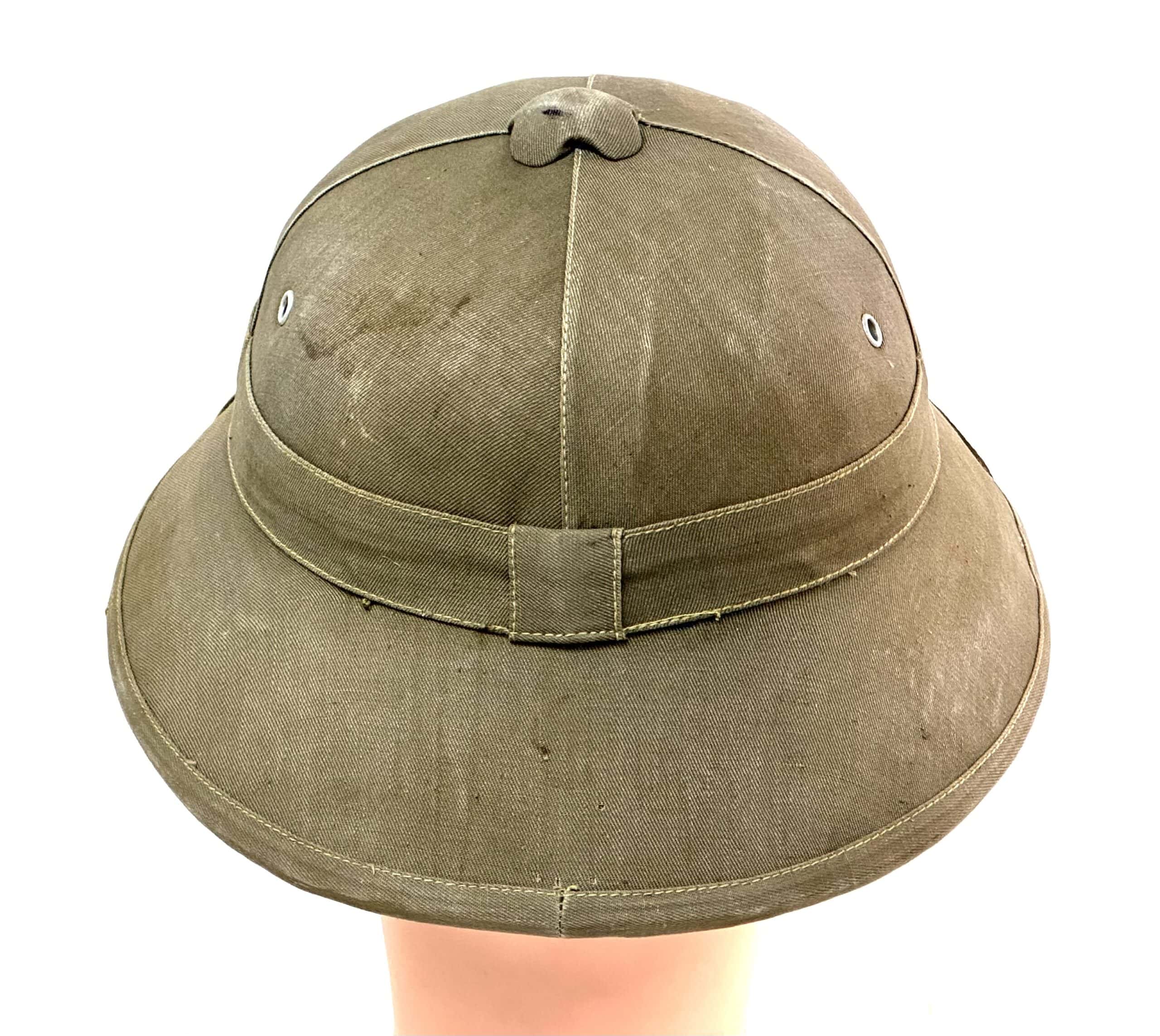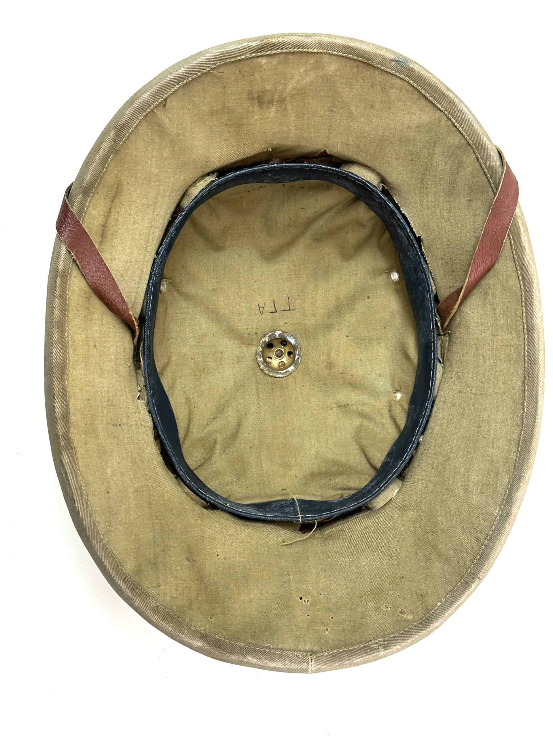 The exterior of these early sun helmets was cotton twill. Khaki was most common but many green ones do exist.