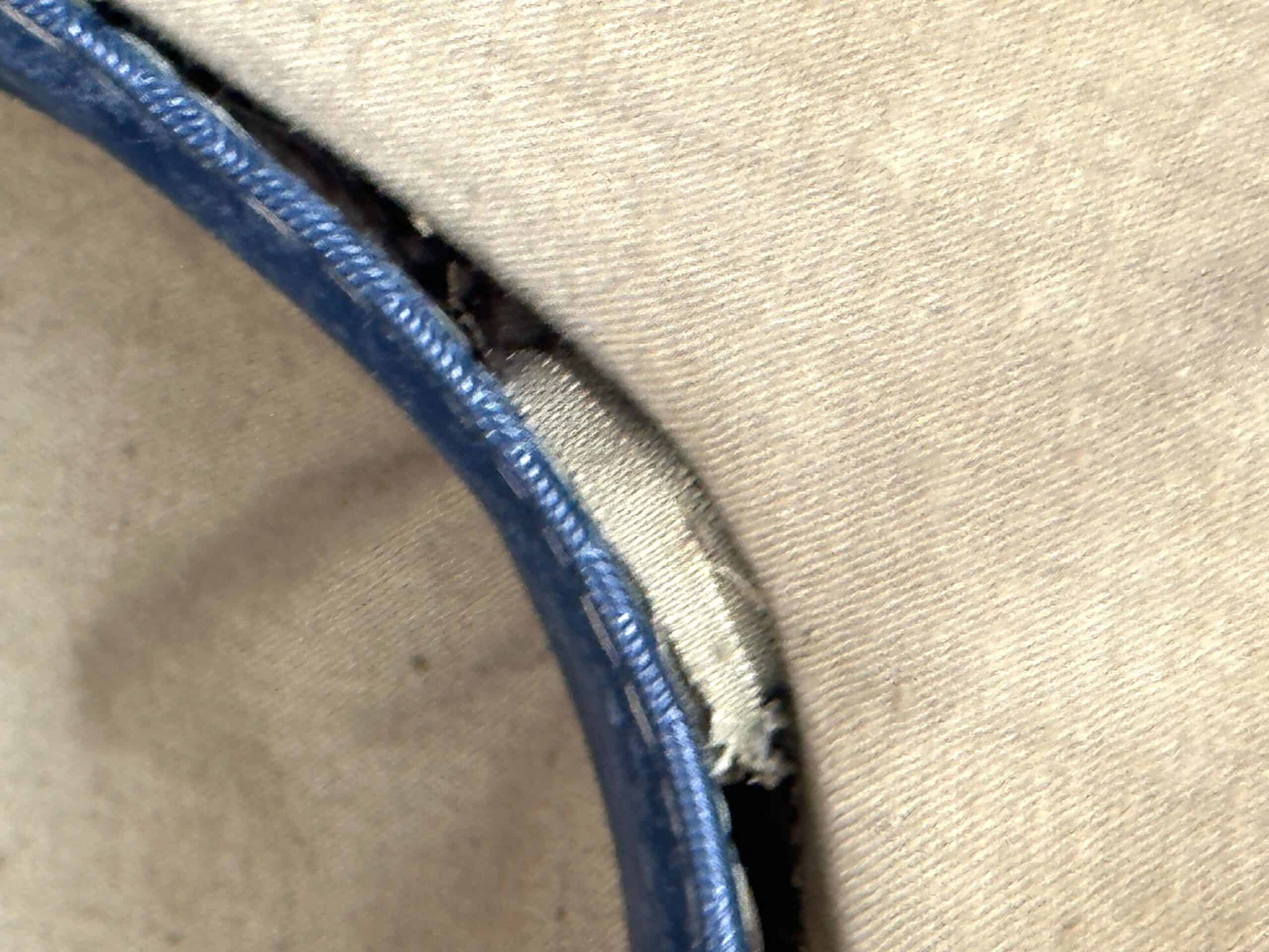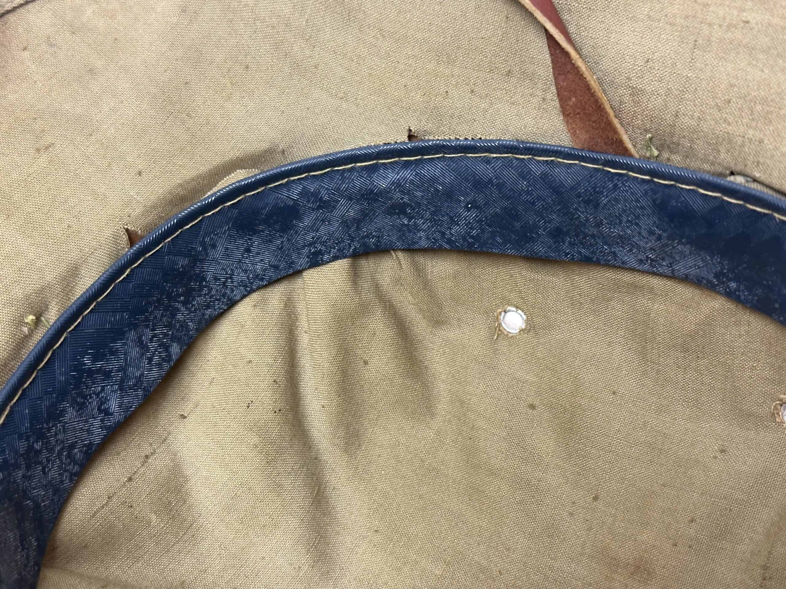 Instead of a bamboo sweatband, an inexpensive green rubberized sweatband with matching crown suspension was riveted directly into the helmet body in four places. The backing of the sweatband and crown suspension was a white cotton.
