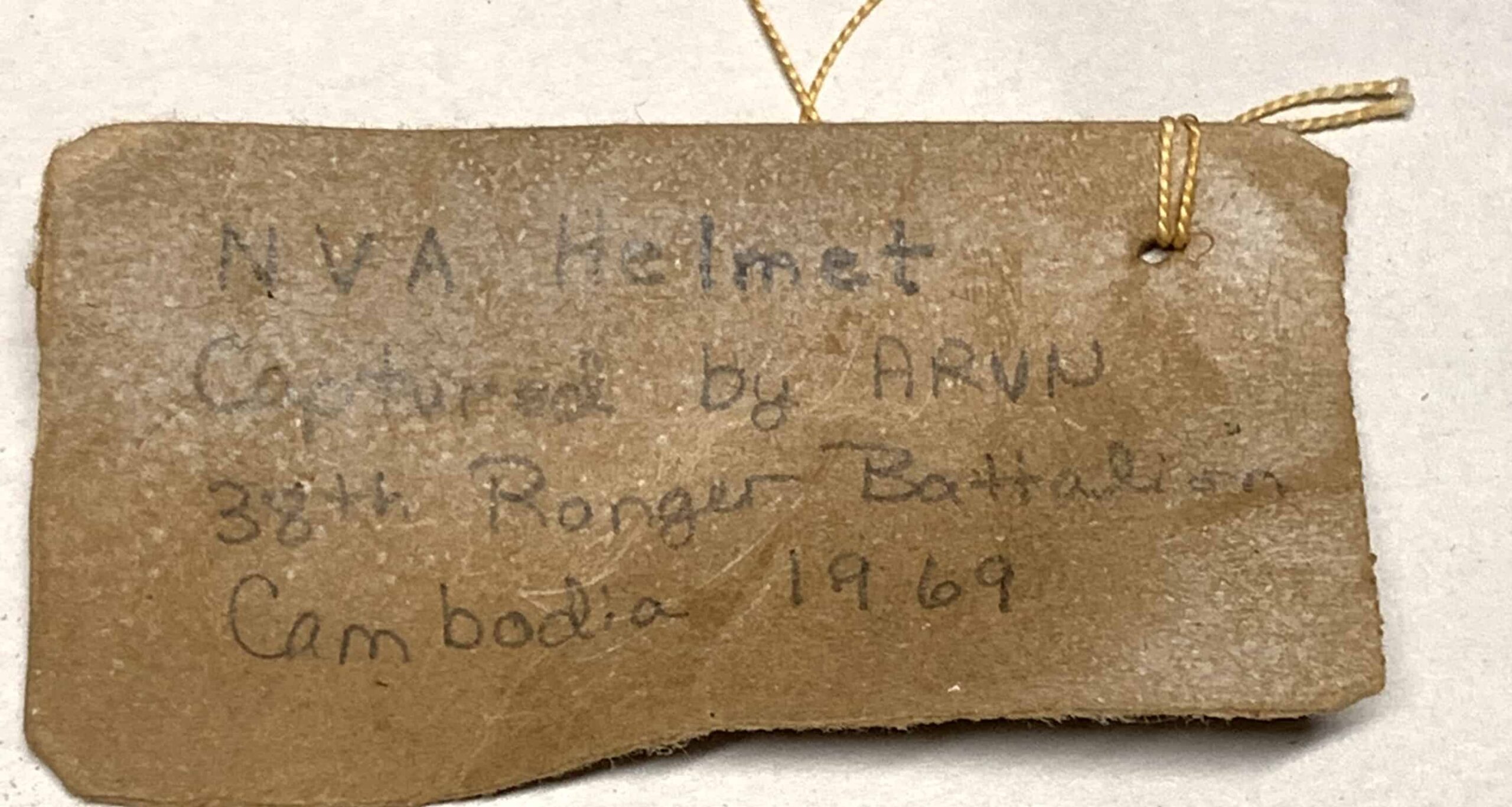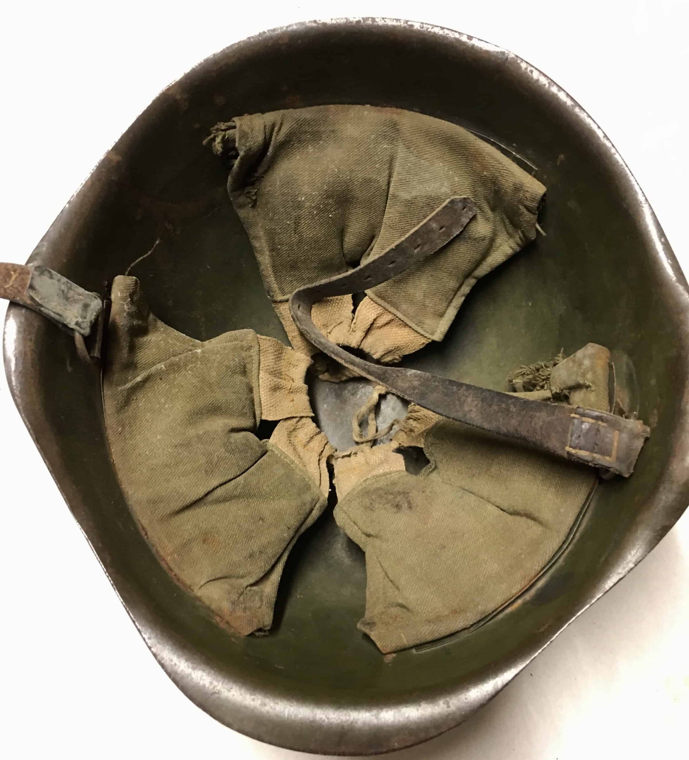 This is a Hungarian made helmet, a copy of the Soviet Model 1940. The Hungarians used cloth instead of faux leather to make the three pad liner in their helmets. It came with a tag indicating it was captured by the ARVN 38th Ranger Bn in Cambodia in 1969. This one has a great jungle patina and represents yet another supplier of communist made war material to Hanoi.