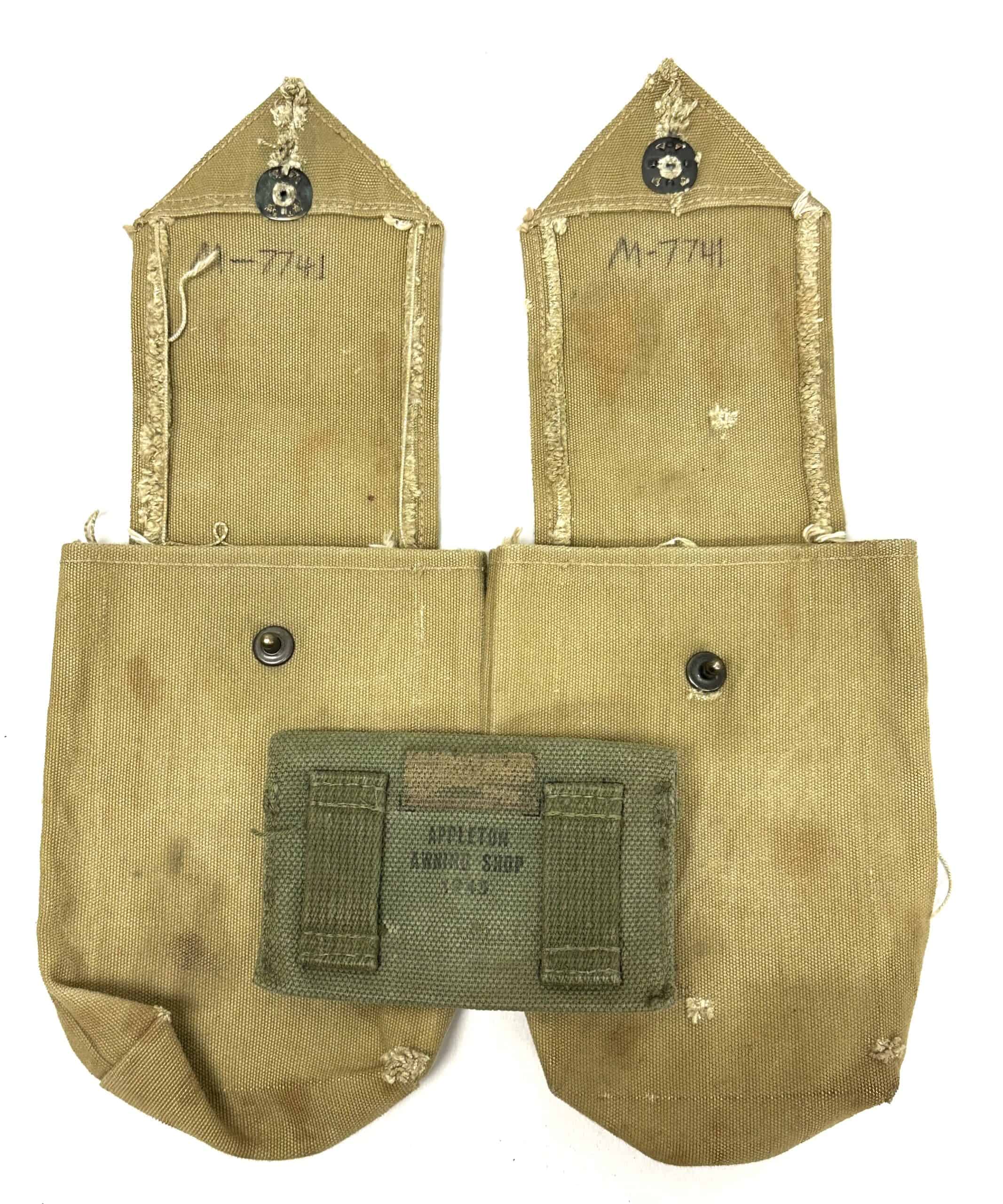 This is a pair of matching, rigger made, Thompson pouches that went through WW2 & were eventually sold as surplus. Fortunately, this pair stayed together. LTD fasteners work.
