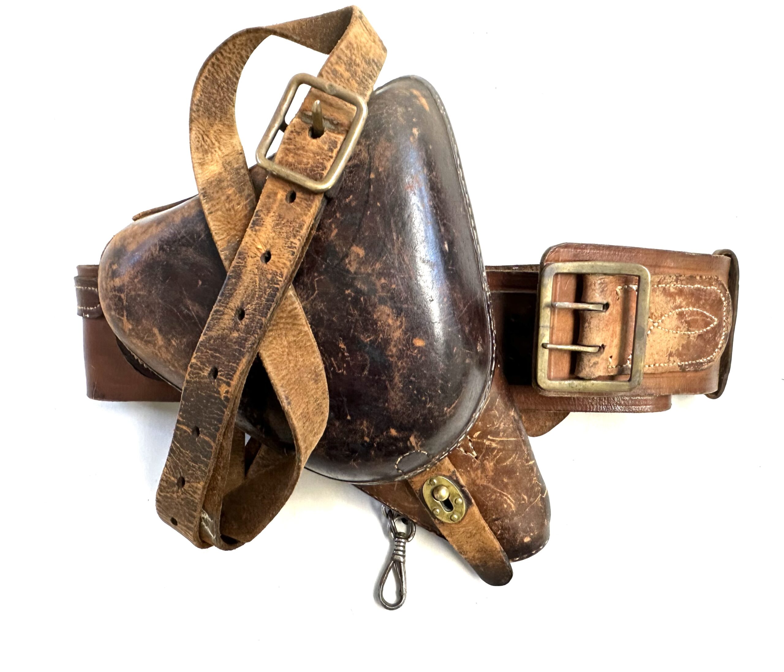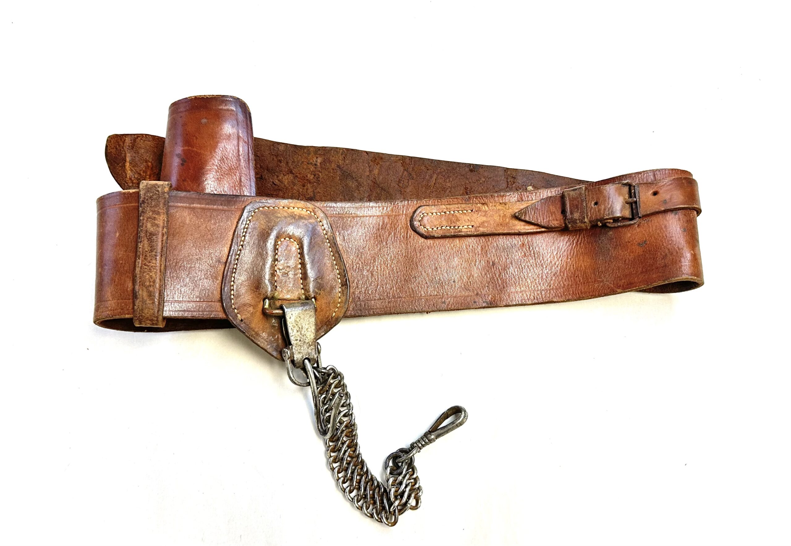 The last photo shows this sword belt along with a matching (color and condition) Nambu holster that we have currently available. The photo is only for illustration purposes. This lot is just for the sword belt.