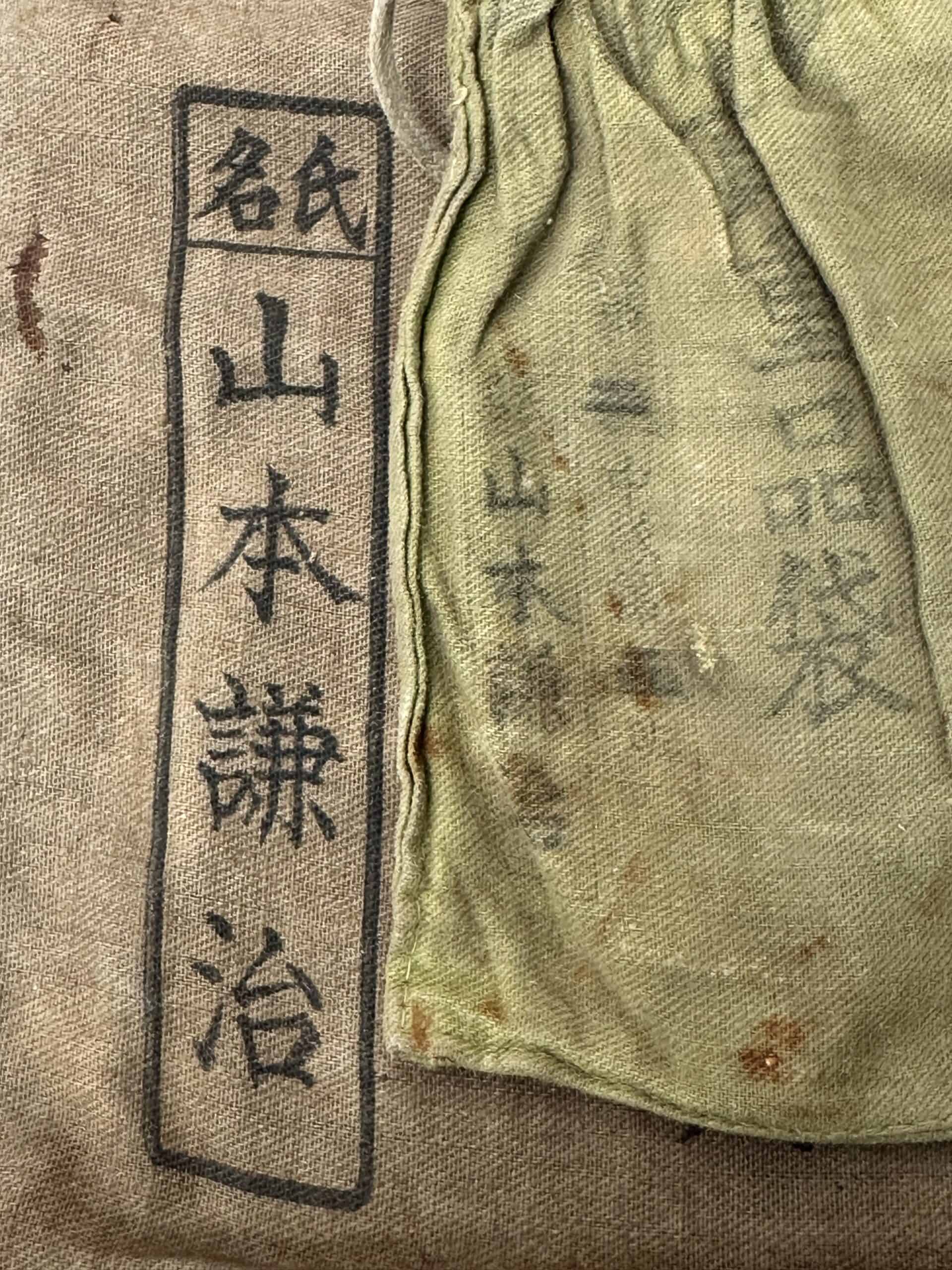 An Army issue effects bag named to Yamato Kenji along with a green ditty bag also named to him.