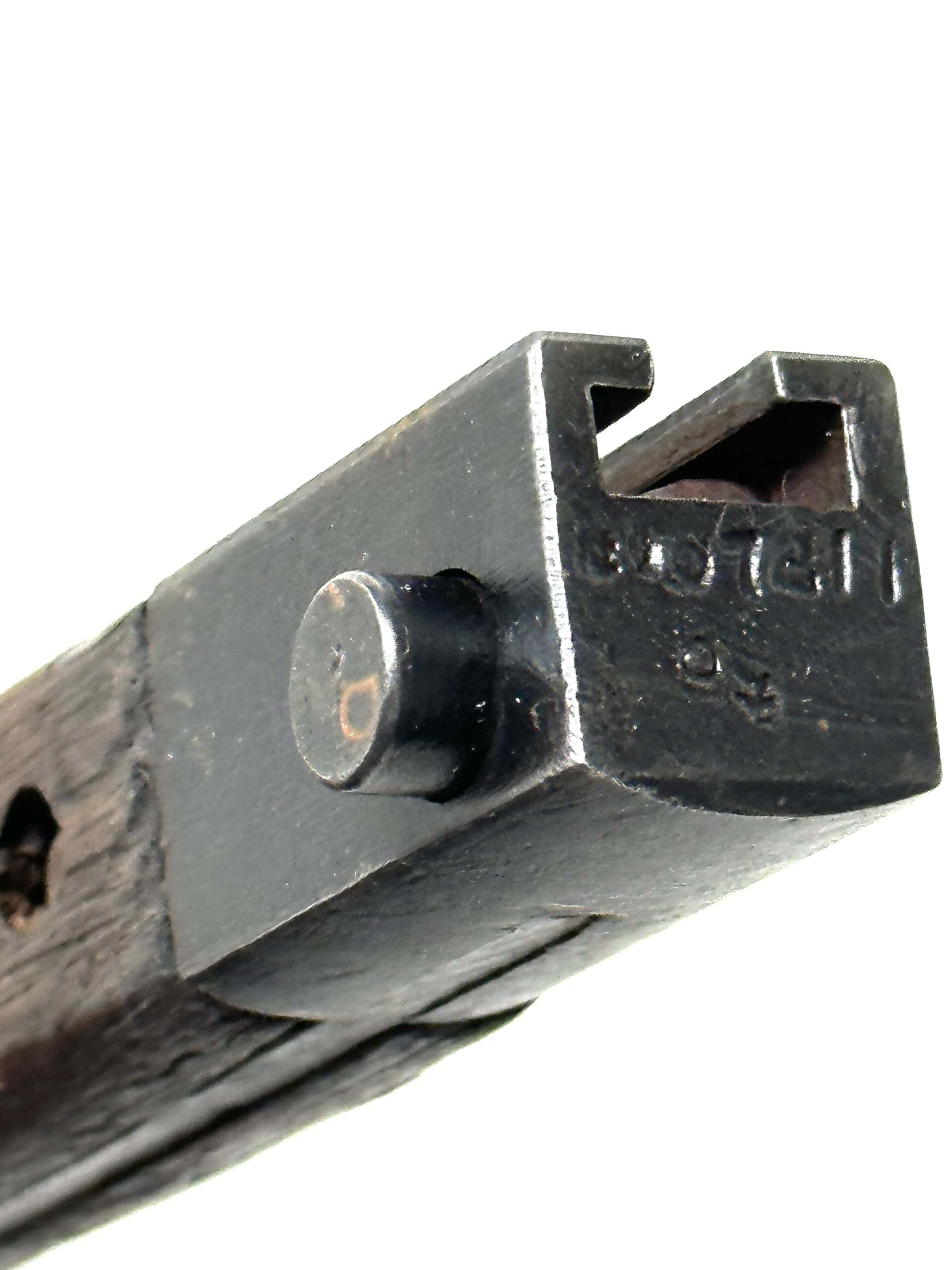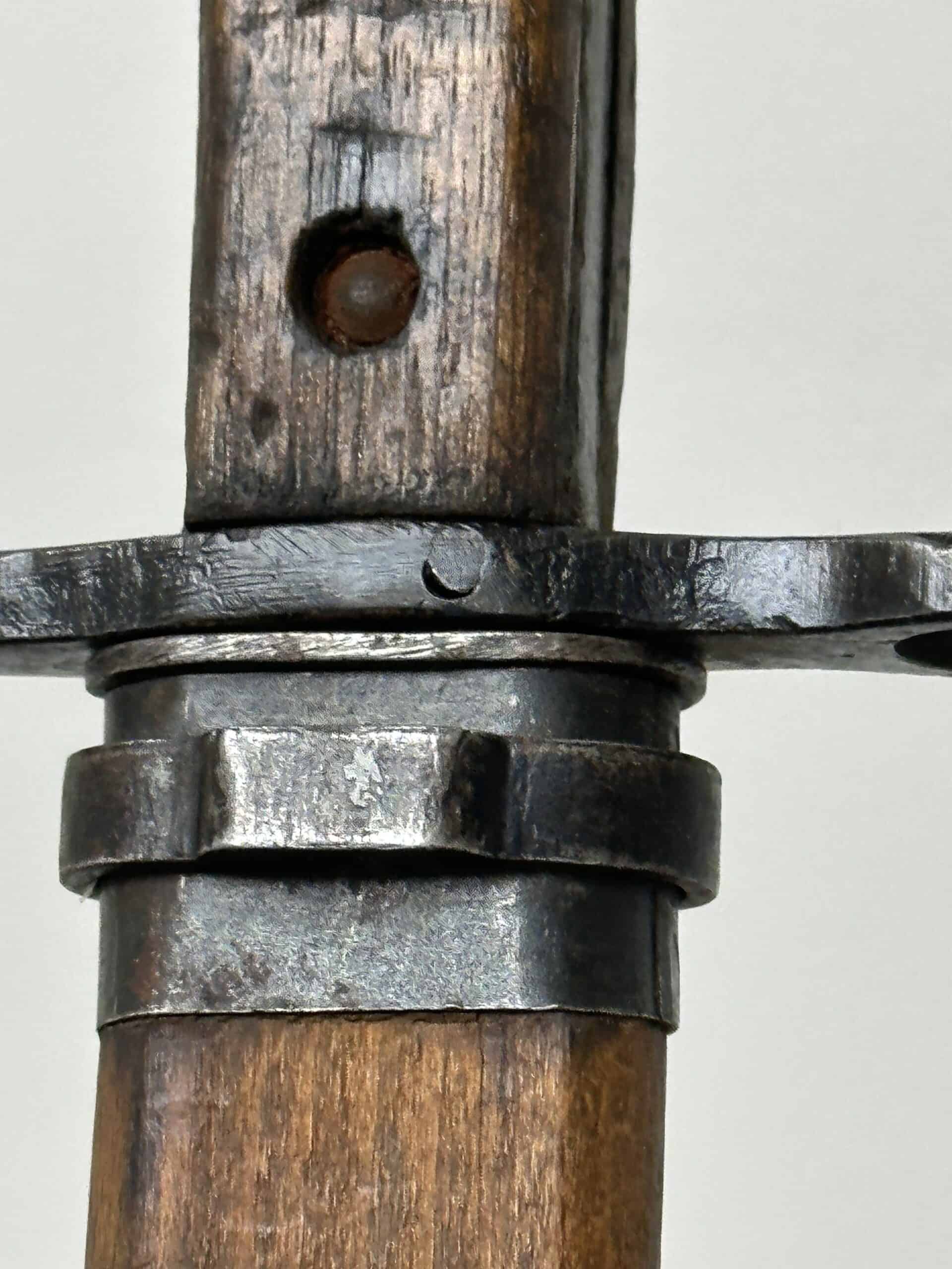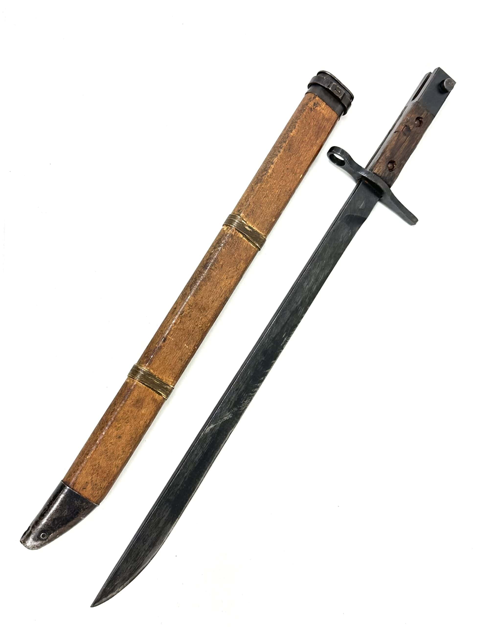 Here is a very rare, last ditch, Japanese type 30 Arisaka Bennett with wooden scabbard.