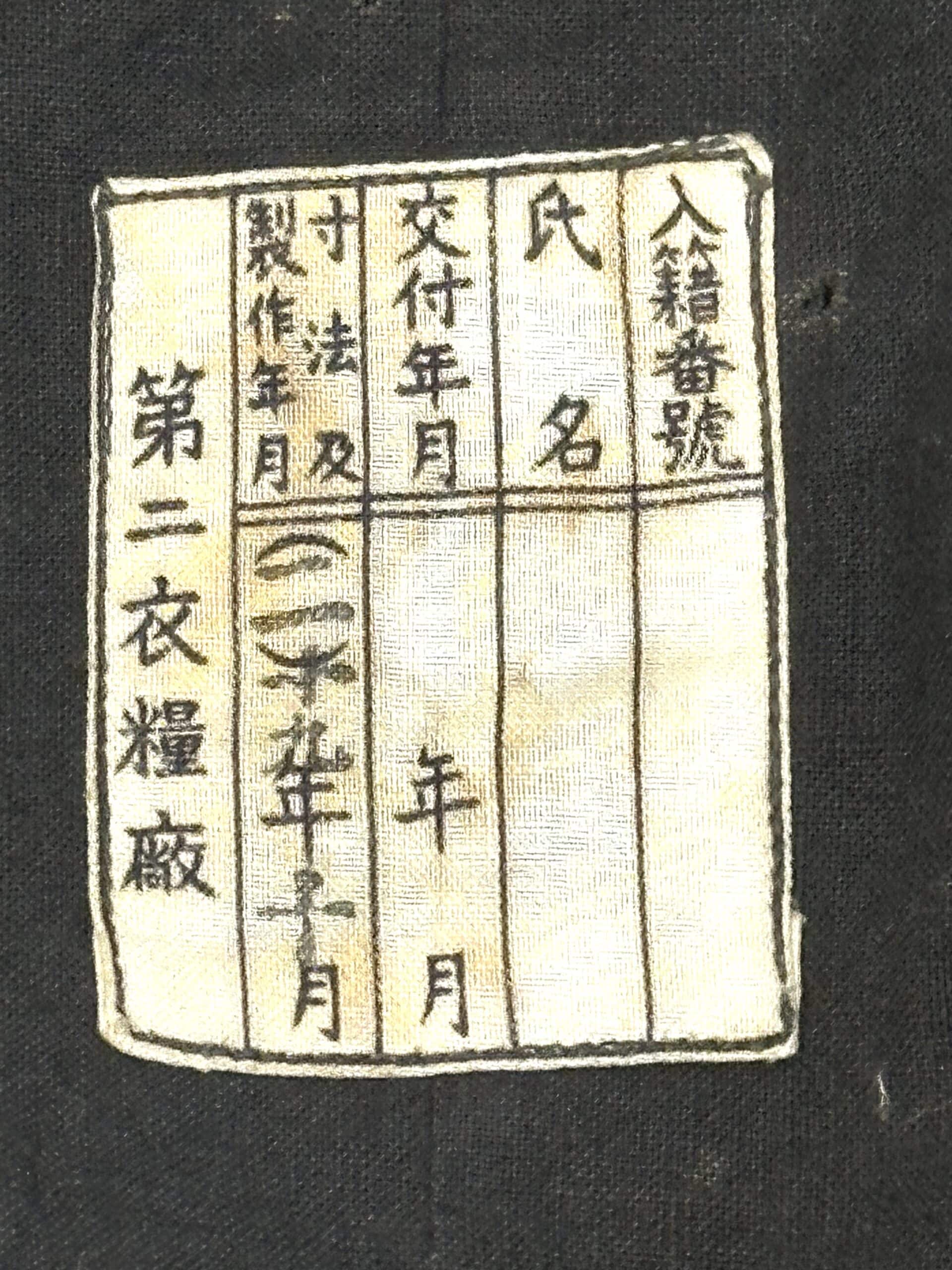 The label on the interior indicates it was made at the Second Naval Supply Depot. It is size medium/size two. It was made in October 1944, which is Showa 19. There is no sailor’s name written on the tag on the interior.